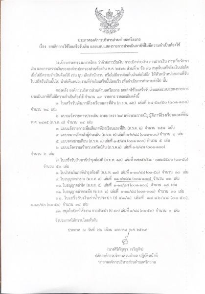 ประกาศองค์การบริหารส่วนตำบลศรีละกอ เรื่อง ยกเลิกการใช้ใบเสร็จรับเงิน และแบบแสดงรายการประเมินภาษีที่ ...